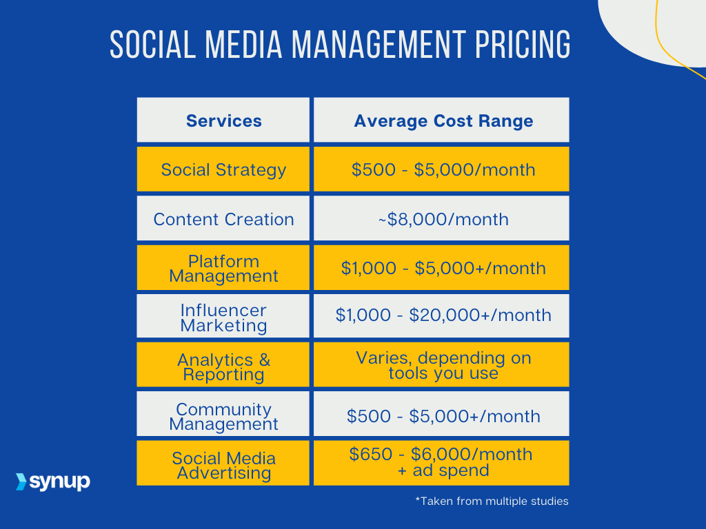 We’ve gathered data from different sources on what agencies and consultants are charging for different types of social media services. This should give you a basic idea of rates for social media management. Remember, your pricing should depend entirely on your business costs, the value you provide, and the type of clients you work with. Don’t take any of these numbers as a hard and fast rule.