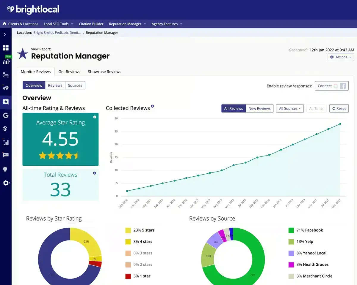 BrightLocal is a top-notch local marketing software with an attractive user interface and excellent analytics and reporting features. Their listing management is manual, which makes citation submissions affordable but can be pricey for updating listings. Their local analytics tools, like the keyword tracker and Grid ranker, provide detailed insights into local performance.